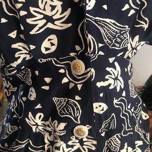Cream shells/nautical print on a dark navy blue background.