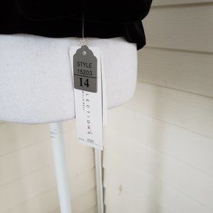 NWT gorgeous elegant black velvet top with a draping neckline. It is has rhinestones embellishing the front center. There is a hidden zipper that actually goes up the back. Brand is KM Collections by MILLA BELL. It is tagged a size 14 however I would check measurements. Material is 90% Polyester and 10% Spandex. Sleeves are 3/4 length.