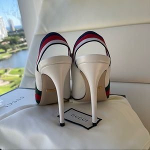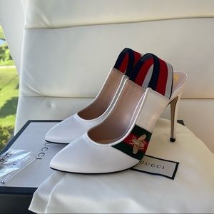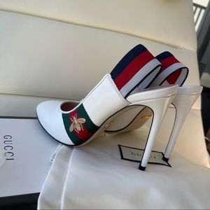 NIB Gucci White Leather Bee Embroidered Slingback Web Pumps 37EU/7US