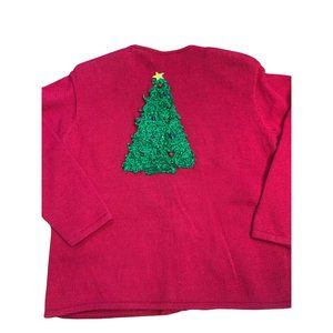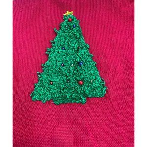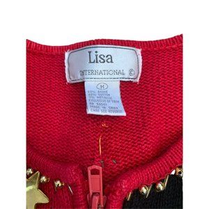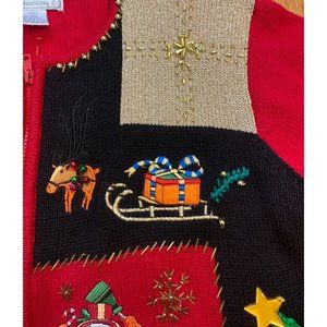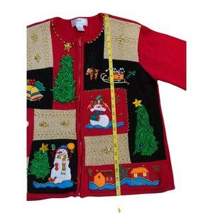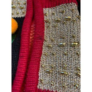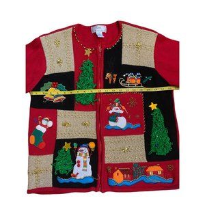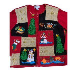 Ugly Christmas Holiday Party Sweater Color Block Snowman Trees Real Bells that Jingle Reindeer Sleigh Christmas Tree Stocking House Cottage with Shoulder Pads! Red sweater with blocks of gold and black complete with a large Christmas tree on the back. Zip-up, a bit heavy and noisy, this sweater is sure to turn heads! There are two small marks that look like pen along the zipper and a few loose strings. Please see all photos for condition and measurements. Prompt shipper. Thanks for looking!