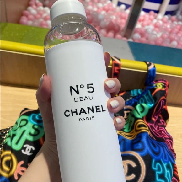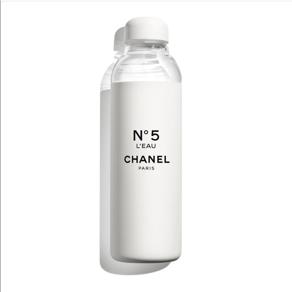 An elegant glass water bottle marked with the same visual identity as the N°5 L’EAU bottle.