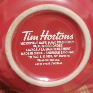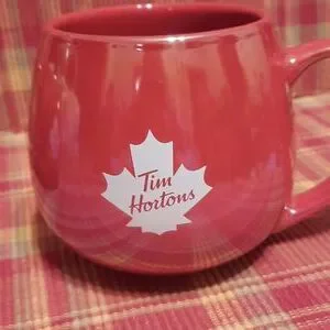 Pair of red iridescent Tim Hortons mugs for tea or coffee.