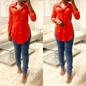 The long line blouse adds fun elements like a shiny satin fabrication to a classic button down silhouette. Complete with a collar, button down placket, long sleeves with buttons at the cuffs, long line silhouette, and rounded hem with side slits.