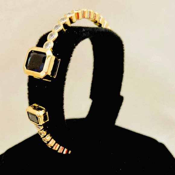 This is so pretty on your hand. This bracelet is an eye catcher! Faux sapphires, and CZ's set-in gold plating.