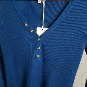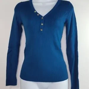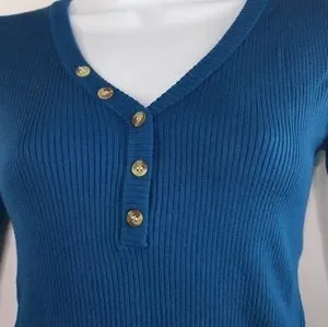 Teal soft and stretchy ribbed knit long sleeve top. Fitted body, buttoned neckline.