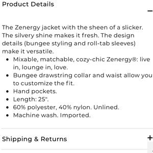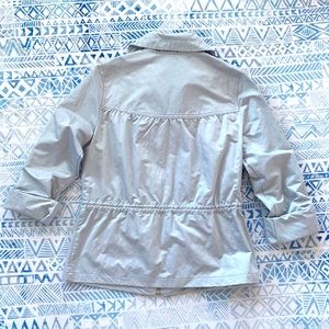 Cute and versatile athleisure jacket from Zenergy by Chico’s. Light gray, silvery color with zip front, adjustable bungee waist, and two front pockets. Chico’s size 0. Excellent condition.