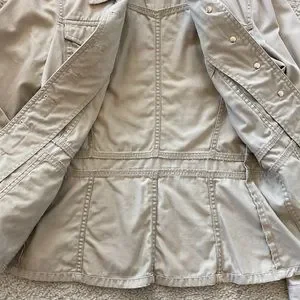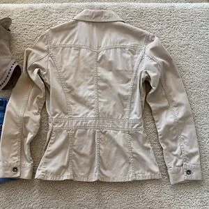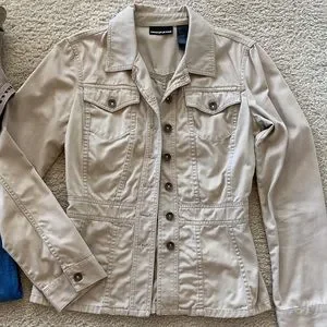 DKNY Jeans Khaki Jacket. Super cute staple! Easy to throw on and go. Like a khaki denim feel. Button front. Long sleeves. Unlined. Laying flat approx 23” shoulder to hem, approx 18” pit to pit. 100% cotton. Size S. Excellent condition.