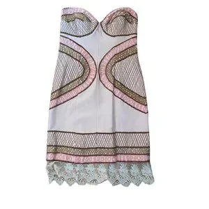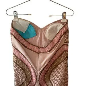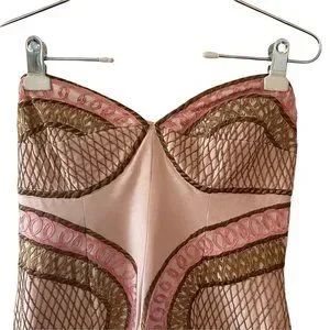 Dress is a bustier straight fit. Size 6. One of the breast cups has been mended as seen in pictures. Side bones. Inseam rear zipper. Lined with 100% viscose. Beautiful cream lace hem.
