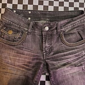 This pair carries a Biker style with multiple metallic pieces sewn all around front and back pockets.