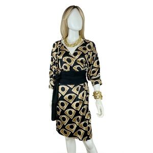 Timeless and Elegant!! Wrap dress with three-quarter length sleeves featuring gathered cuffs, fan print patterns throughout, dual seam pockets at sides and sash tie closure at waist. Silk, Lycra. Black/Camel/Natural/Gold. IN EXCELLENT CONDITION!!!