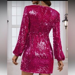 Luxe Hot Pink Sequin Long Sleeve High Waisted Party Evening Dress