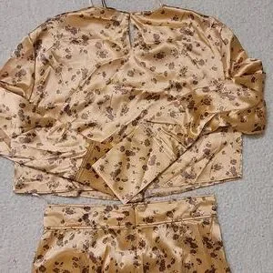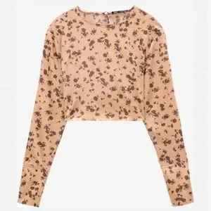 Set of cropped long sleeve floral satin top.