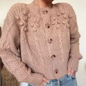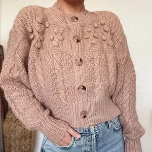The Meghan Sweater features a cardigan silhouette, button down front, puff sleeves, and pom pom design.