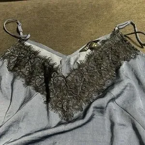 Blue camisole with black trim lace.