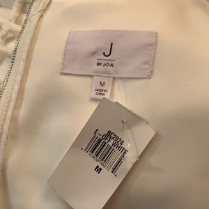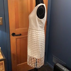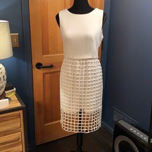 A caged crochet overlay skirt adds interest to a sleeveless mini dress in off-white. The dress is partially lined and has a back exposed to zipper. Shell: 95% polyester, 5% spandex. Contrast: 100% cotton. Lining: 100% polyester. Measures approximately 36 inch length and 18 inches pit to pit. 399. Excellent condition. Never worn.