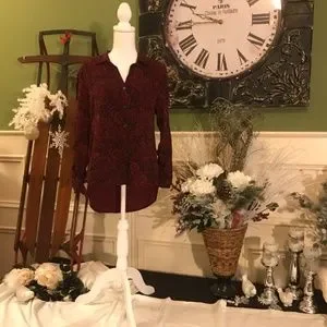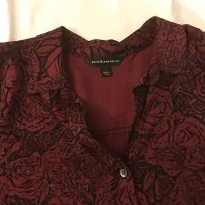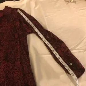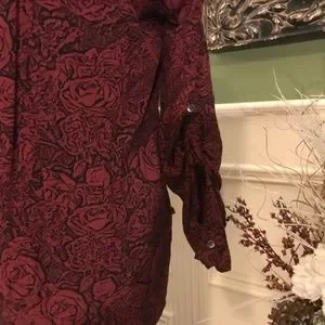 Pre owned - excellent condition, no stains, no tears, maybe worn once . Dark burgundy Red and black rose design high low shirt. Sleeves have 2 buttons for roll up