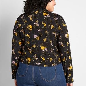 New with tags. ModCloth long sleeve black floral button down blouse. Sizes XL, 1X, 2X.
