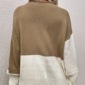 This is a contemporary style colorblock sweater with a drop shoulder and relaxed fit