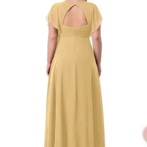 Azazie Rylee Gold Bridesmaid Dress in their standard size 14. Only worn once. There’s a small mark near the bottom of dress. Bottom dress a bit wrinkly from folding up. Still in good condition.