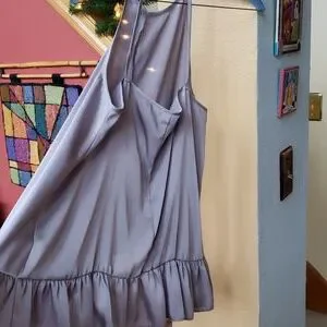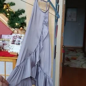 Asos brand silvery lilac satiny ruffle halter blouse. A stunner with cascading ruffle down front asymmetrically to ruffled hem. Classy, chic and sexy with black skinnies. So pretty!! Measures: 17" armpit to armpit Length is 21" front 24" back. Size 8 new without tags