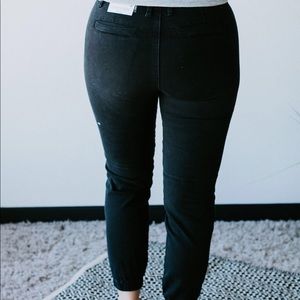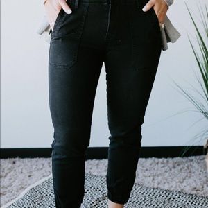 These cotton-blend denim joggers are such a casual and chic vibe! Trouser style design with a mid-rise and skinny leg fit. Finished with elasticized cuffs with hidden ankle zipper. Exclusive Jillian KanCan Joggers are available only at Lauriebelles.
