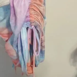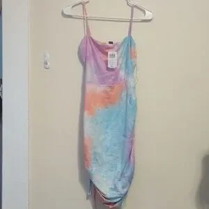 Tie dye body con dress with adjustable ruched siding size large. Never worn, with tags