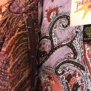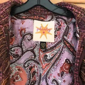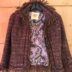 Standout tweed jacket by Plenty. Excellent condition. Beautiful shades of pink, brown, purple & taupe in a wool blend tweed. Beautiful boho lining you will want to show off! Piping and fringe ad extra oomph. Hidden hook closures. Size 4, but a snug 4 that can fit a size 2 as well. About 21 inches in length. Work appropriate or wear it with jeans for a funky look. Care instructions: dry clean.