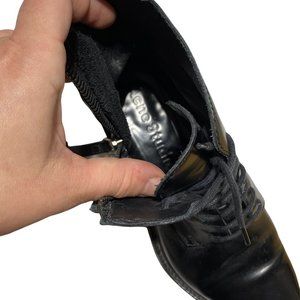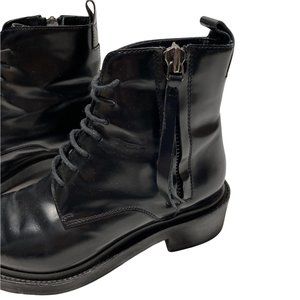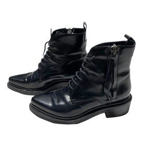 Black leather combat style, lace up front, zipper side closure, sleek pointed toe. Well designed, heavy duty. EUC, light sign of wear, creasing and light wear on the soles.