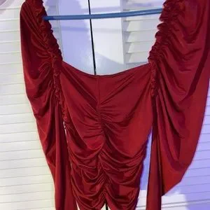 This is a beautiful burgundy top with puff shoulders, it’s very fitting and perfect for a night out, it’s brand new never before worn with tags!
