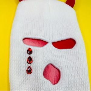 Unisex Super Sick Punk Gothic evil Red horns white knit plain solid color Ski mask unisex with bloody red color tears dropped acrylic rhinestones. Handcrafted by me. Hope you like it 🖤.