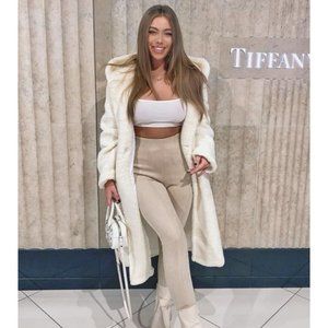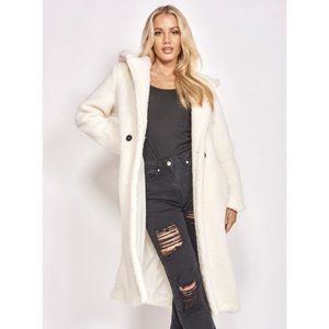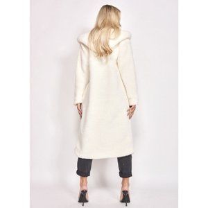 Off White Hooded Long Sleeve Long Maxi Borg Teddy Bear Fur Coat