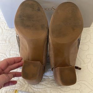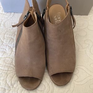 Women size 10 open toed Franco Sarto leather shoe. Two functional zippers on each side 4 inch block heel. I wore these once minimal wear. There are Small stain on both shoes, have not tried to clean them off. I will be selling all of my shoes. Stay tuned