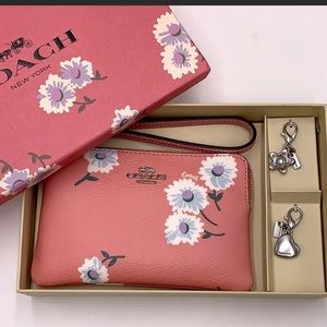 NEW! Coach Wristlet with Logo’d Charms Gift Set. Printed Canvas Coating. Wristlet is 6.25”x4”. Beautiful Pink Adorned in Daisies! Beautifully Packaged in a Decorative Coach Insignia Box.