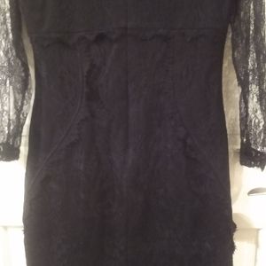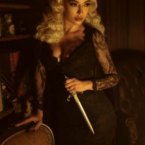 Excellent condition La Femme en noir large La Dentelle dress. This dress has a nice amount of stretch and the material is so nice. Fully lined, lace is not itchy. Eyelash lace on bust and.bottom.hem.as well as beautiful detailing in the sides and under bust. Live your best vampire goddess life. No belt. Zipper is a hearty invisible zipper not one of those horrible small ones. Gorgeous dress, sold out on site. Dress is in beautiful condition. Belt not included. I do sell on other platforms as well so if the dress sells it will be marked NFS.