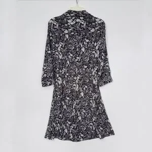 A beautiful Black and White print to take through all year round! 3/4 sleeves. Collar. Button down. Elastic waist for slimming shape. Missing tie belt, add any belt! Button cuff. 2 open chest pockets. Dress this up or down! Wear layered with fur vest and high boots for winter, flip flops or wedges during springtime! Lots of wear and possibilities! Size 4 - EUC!