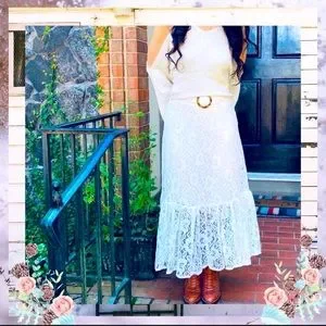 The Perfect Piece to your Closet no matter the Season Beautiful White Lace Maxi Skirt in Size Medium. This Lace is unbelievably soft in 60% Cotton & 40% Nylon. The 3/4 Length Lining is 100% Rayon. A Tortoise Shell Colored Buckle accents the Adjustable Belt. It closes with a Hidden Side Zipper. Measures 14" Across Waist & 33" Long. This is the perfect skirt for any time of year. Perfect with Boots or Booties or Sandals; It melds to what-ever style you choose for the day. From Bohemian to Western Chic. It's Beautiful yet comfortable & versatile!