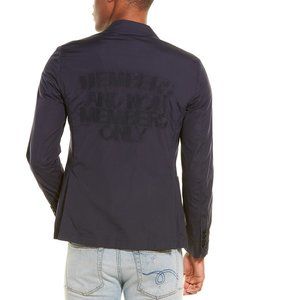 Pop Dream Jacket in navy with notch lapel, dual front pockets, button cuffs, embroidered back, interior pocket, and side vents