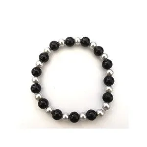Black faceted round acrylic beads, black glass beads, silver coated color pearls, gunmetal link chain? lobster claw closure, matching earrings and stretchable bracelet OSFM, necklace: 32", earrings: 1" drop length shepherds hooks.
