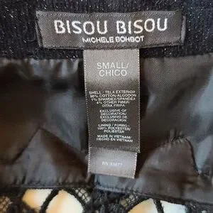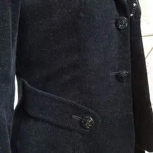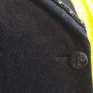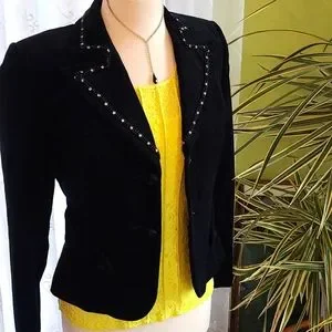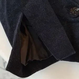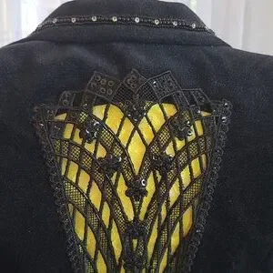 This jacket is exclusive of decoration and WASHABLE which I have done on delicate cycle, cold water, and no dryer. ๐๐ค. Fully lined. Courdery fabric has a silver sparkle throughout. Braided embellishment along collar and lapels with rhinestones. Back of jacket has black beaded lace cutout. Sleeves are approx 18 inches from armpit seam to sleeve hem. There is a 5 inch vent at base of sleeves. Mannequin is 36.5 bust and hips. Jacket sideseam from armpit to hem is approx 13 inches long.
