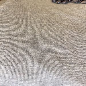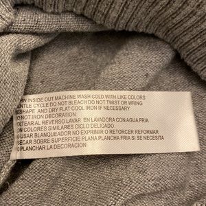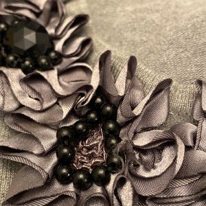 Gray button up the front crewneck sweater. Pretty, clear buttons with ribbon and beading embellishment around neckline. Could easily be worn with an elegant skirt or to dress up a pair of jeans! Slight pilling – shown in picture – on front. Also, one black bead is missing on neckline decoration, also shown in picture. GUC.