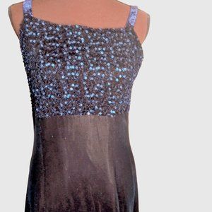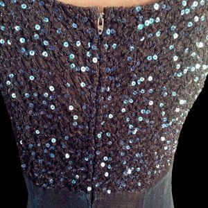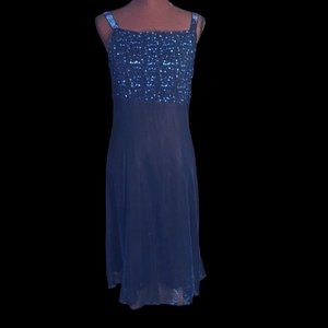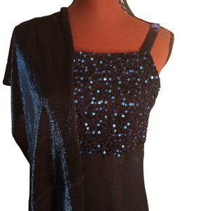 Listed for Sale is a Betsy and Adam Vintage Dark Blue Iridescent Shimmering Formal Midi Dress with matching Scarf by Jaslene. The dress is an Empire Style, Dress with a slight flare bottom, Sequined and beaded bodice, Shoulder Straps (Not spaghetti), is lined and has a back hidden zipper.