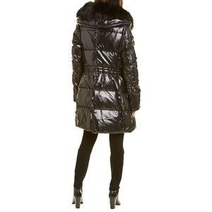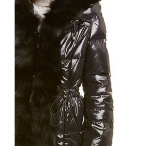 Color/pattern: black Approximately 36in from shoulder to hem Model is 5'11 and is wearing a size small. Measurements may vary slightly by size. Design details: double layered pillow collar, drawcord at waist, two zippered front pockets, fur trim Snap closure Medium weight Shell: 100% nylon Lining: 100% polyester Fill: 80% duck down, 20% goose feathers Fur: dyed fox (Finland) Clean by fur trim Made in Italy RN#: 135466