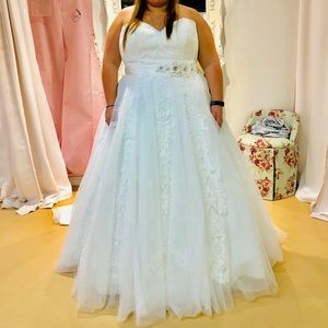 Beautiful Stella York wedding dress. Tailored to 5’4” with bustle added. Worn once on the beaches of Mexico. Zipper in the back with faux buttons. In excellent used condition. Belt not included. Will need to be dry cleaned.