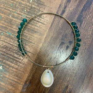 Emerald green beaded hand wire-wrapped tarnish free brass bangle with authentic cowrie shell. Med/large.