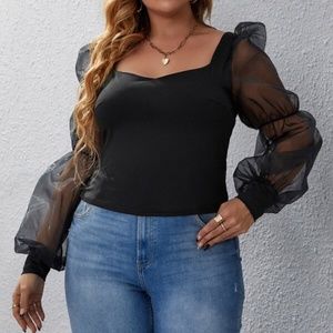 Plus Black Sweetheart Neck Puff Sheer Sleeve Blouse