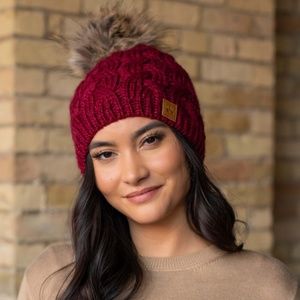Maroon solid knit fleece lined cable sweater winter beanie with faux fur fuzzy pom pom.