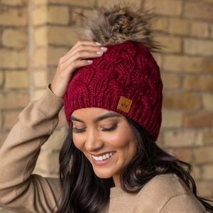 SOLD OUT Maroon Cable Knit Beanie Hat w/ Faux Fur Fleece Lined Pompom Winter Hat