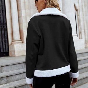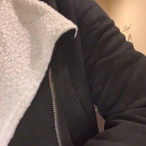 white shearling teddy lined cuff collar zip up Moto vegan suede jacket'