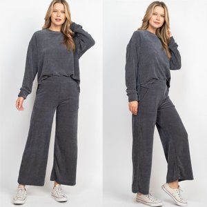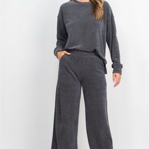Loving this 2 piece set, it is ultra soft textured material, the pants are comfy with pockets, the shirt offers a relaxed fit. pair with your favorite tennis shoes and our gray fedora hat!