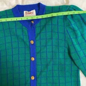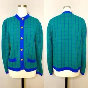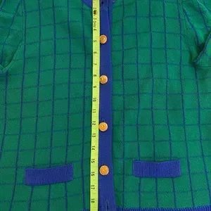 The perfect preppy cardigan similar to the Chanel and St. John knits. Last gold button missing and top button is loose but both can easily be fixed (pictured). Pretty Kelly green and electric blue checkered pattern. Balloon sleeves. This could fit a small or medium.